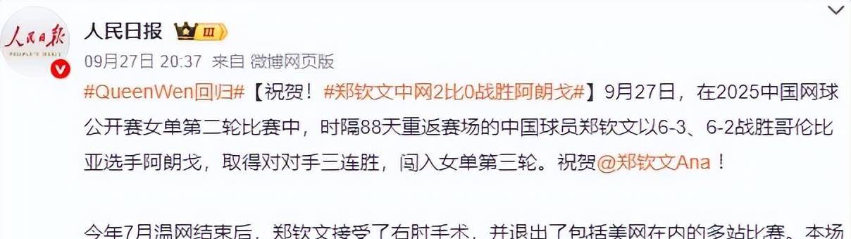更让人惊叹的是,她居然以2-0的完美战绩击败对手!《人民日报》更是发文狂赞:Queen Wen霸气回归!
